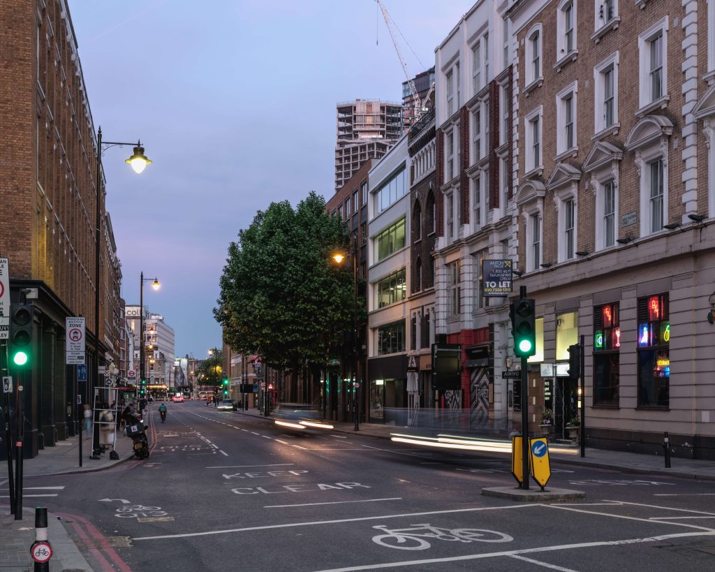The existing building was characterised by unattractive green panels and a generally poor appearance. To unify the facade, we introduced horizontal banding to connect it with its neighbours. The building on the right was listed, necessitating a careful design approach. We simplified the facade with two-tonal colours, creating a dark plinth and a white upper section.